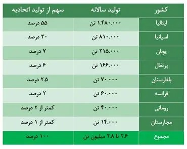 برنج در اتحادیه اروپا در مقایسه با غلات اصلی، محصولات باغی و بخش دامی سهم محدودی در کل تولیدات کشاورزی دارد، اما ساختار تولید آن نسبتا پایدار و به‌شدت متمرکز است. بر اساس داده‌هایFAOSTAT و برآوردهای کمیسیون اروپا برای سال زراعی ۲۰۲۴، مجموع تولید شلتوک اتحادیه حدود ۲.۶ تا ۲.۸ میلیون تن در سال است که تقریباً تمام آن در هشت کشور عضو انجام می‌شود. دو کشور ایتالیا و اسپانیا بیش از چهارپنجم این تولید را به‌صورت مشترک در اختیار دارند و تعیین‌کننده روندهای بازار و سیاست‌های مرتبط با بخش برنج در اتحادیه هستند. جدول زیر وضعیت تولید شلتوک برنج در اتحادیه اروپا در سال 2024 را نشان می دهد: